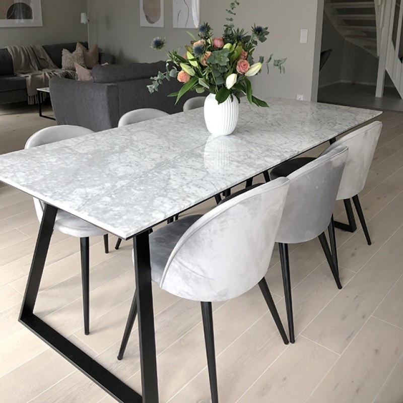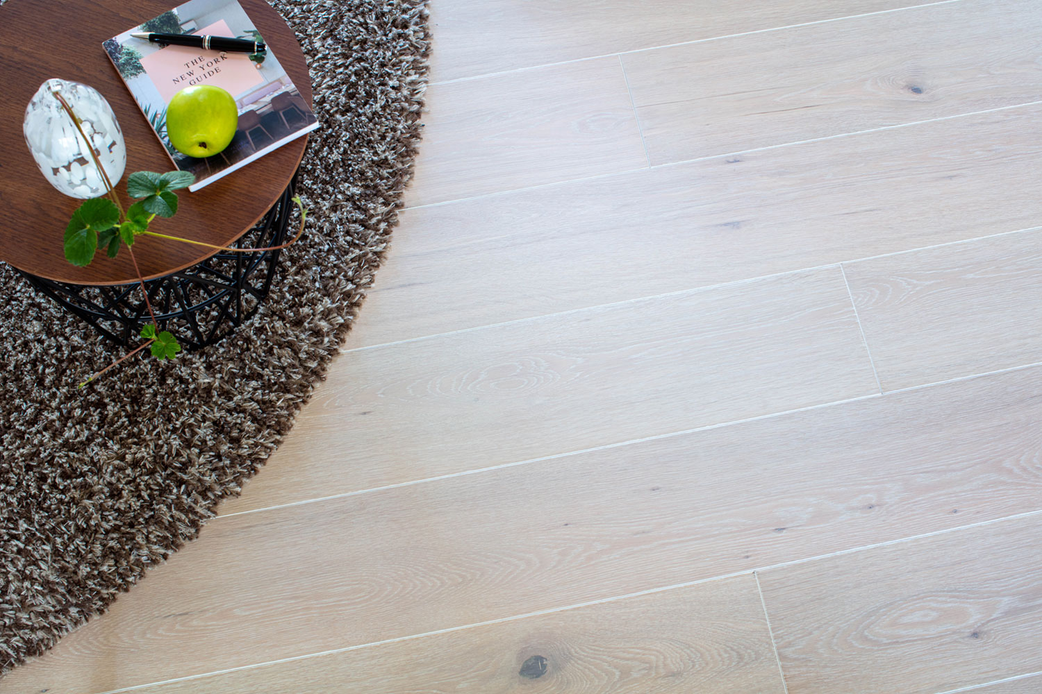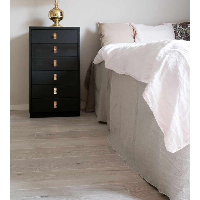 Golvplankorna är mattlackade med vitpigmentering vilket gör att rummet får en ljus och fräsch känsla samtidigt som basen fortfarande ligger i ekplankornas naturliga nyansskiftningar. Dessa naturliga variationer gör att varje golv blir unikt. Mattlacken gör dessutom att golvet är slitstarkt och lättskött. Golvet kommer med 20 års garanti.